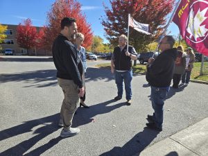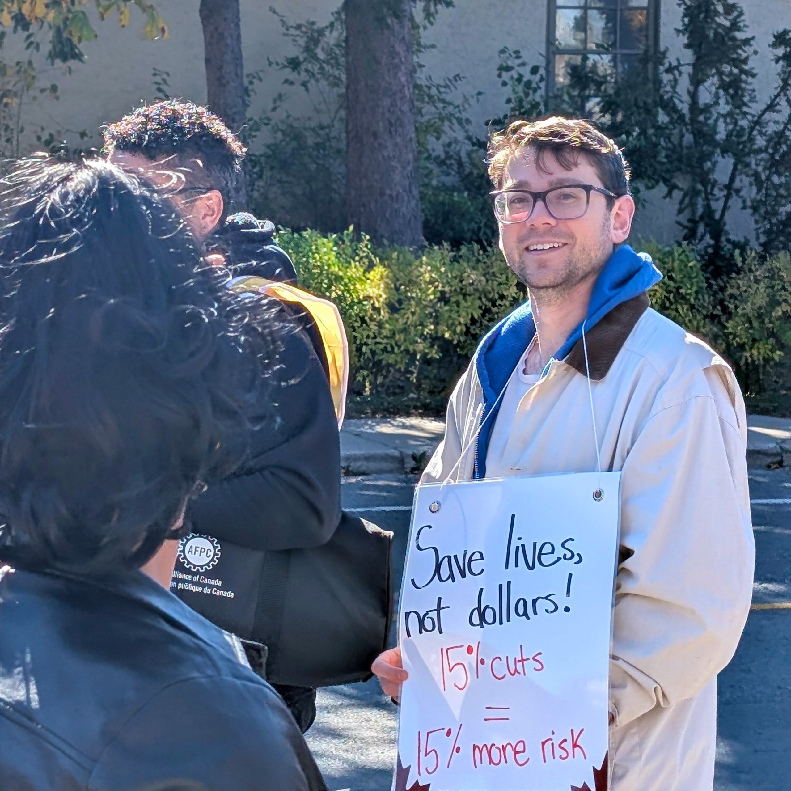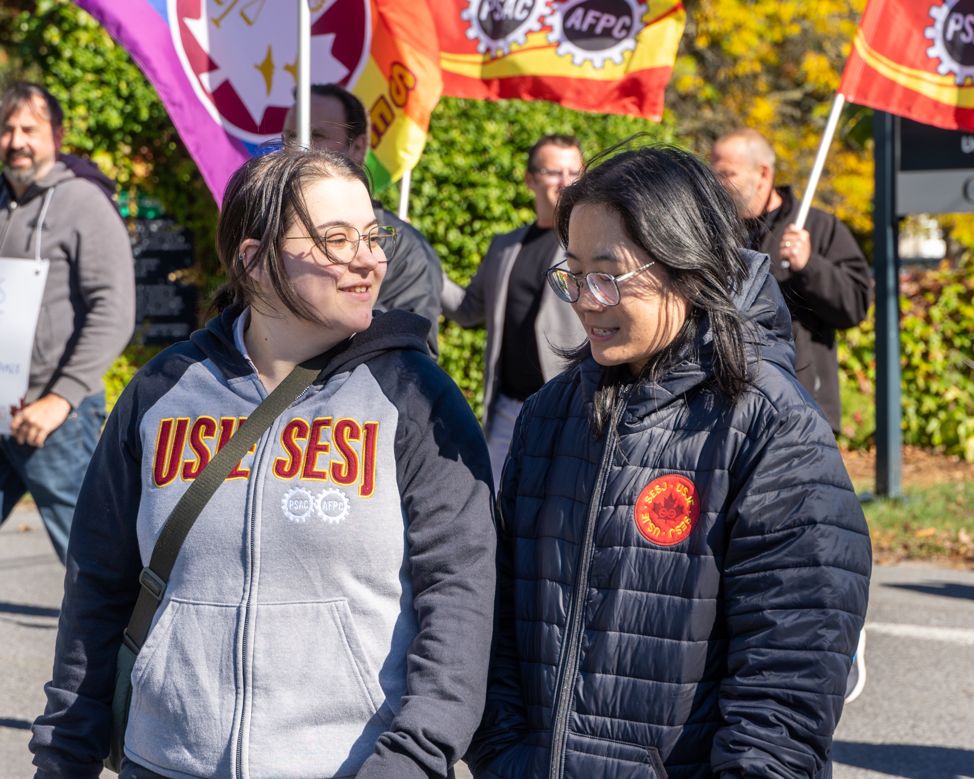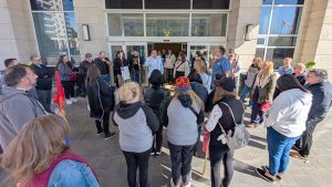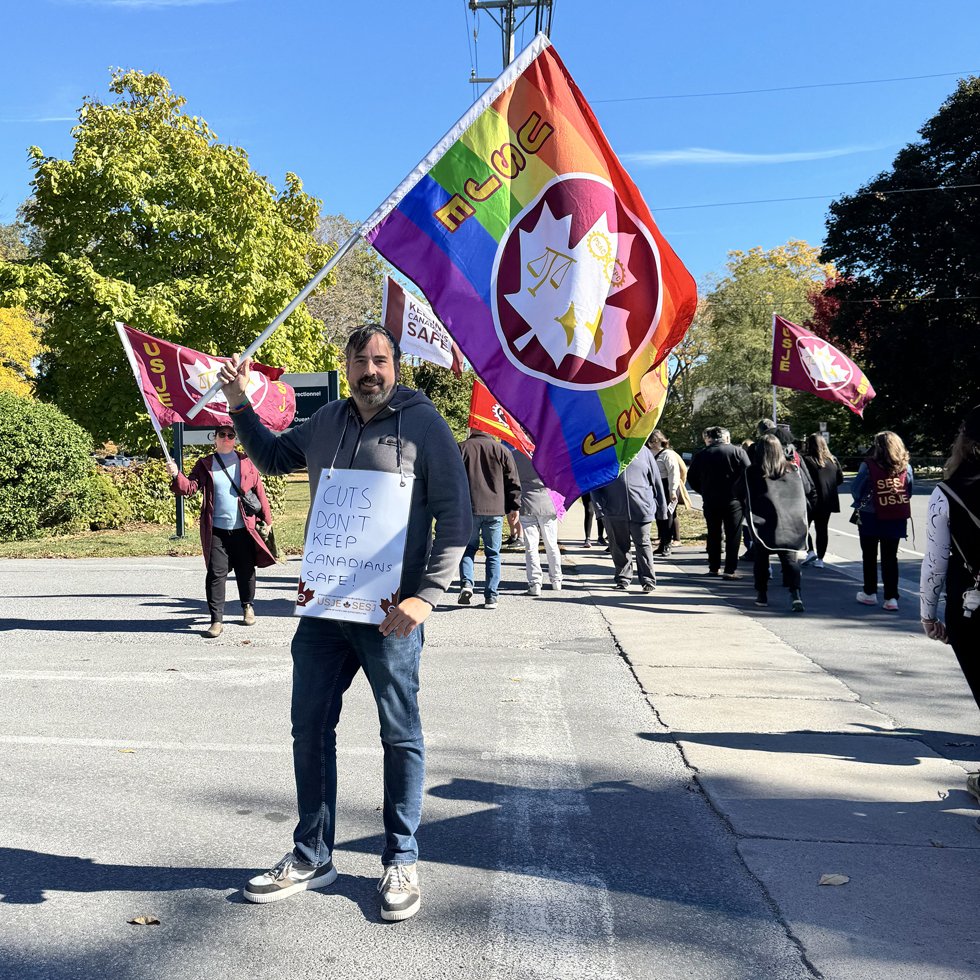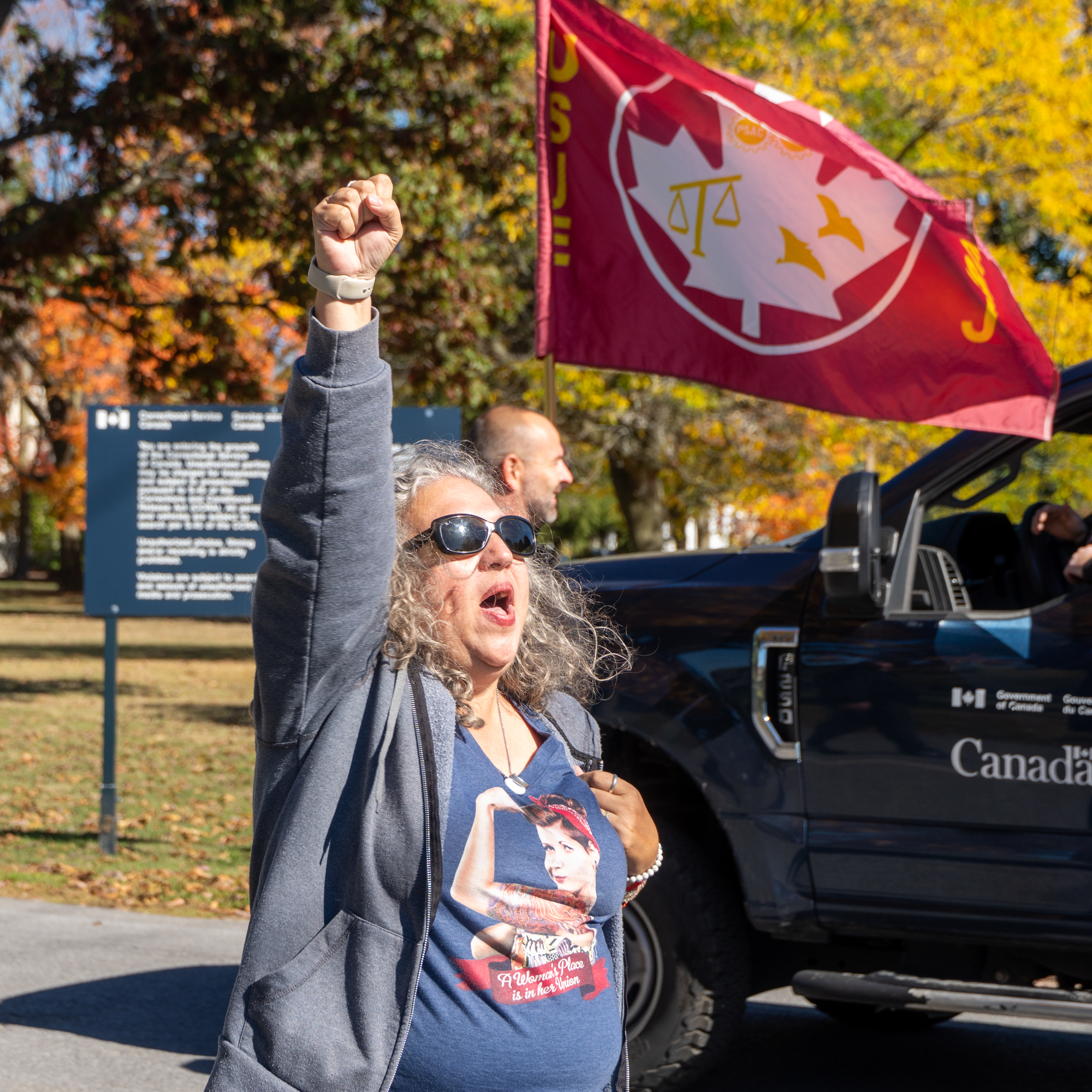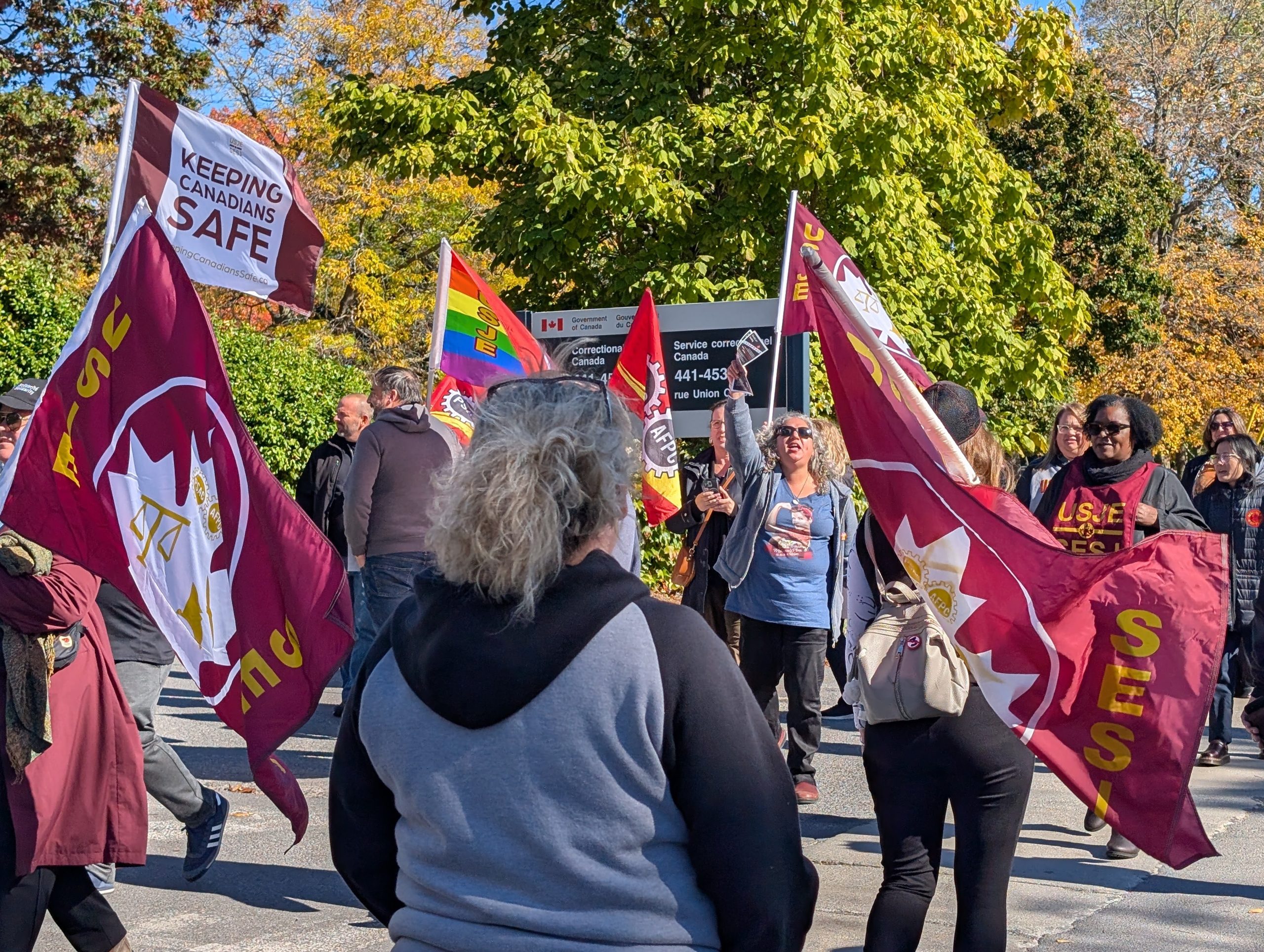 Both the winning photo and video were captured during the lunchtime rally at CSC Ontario Regional Headquarters. USJE members marched along both entrances to the building and stopped cars to bring attention to the planned budget cuts, how they will impact our members’ work, and the many implications to public safety. President Neufeld ducked inside and attempted to meet with the Regional Deputy Commissioner, Kevin Snedden, however the Acting Assistant Deputy Commissioner Integrated Services, Jamie Contois took the time to come outside and meet with USJE. The rally was a huge success and a first for several participants!