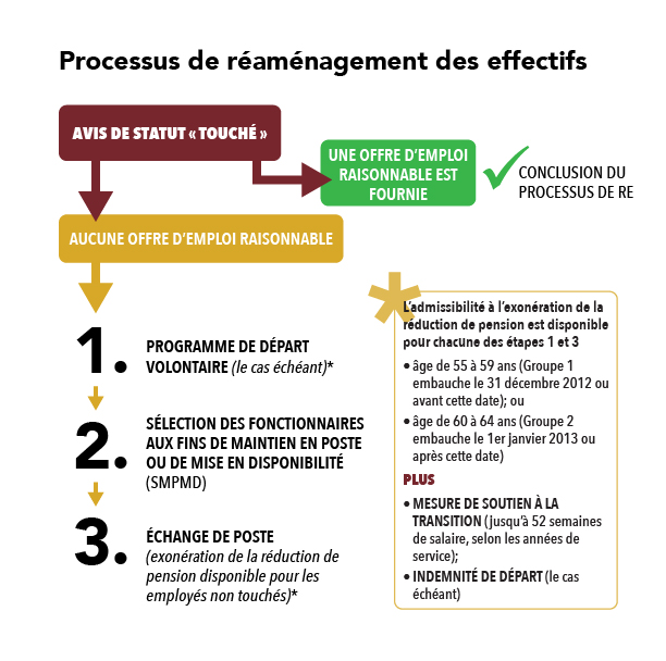 Ce que le budget et le programme d’IRA ne soulignent pas, c’est que les dispositions relatives au réaménagement des effectifs (RE) qui ont été négociées avec soin dans nos conventions collectives prévoient déjà une exonération de la réduction de pension (même si l’âge requis est plus élevé que celui de l’IRA) AINSI QUE des avantages financiers et des aides supplémentaires pour les employés, de même qu’une supervision syndicale et une meilleure gestion des ressources humaines. Vous trouverez ci-dessous ce qu’un membre du SESJ visé par la Loi sur la pension de la fonction publique pourrait potentiellement recevoir dans le cadre du processus de RE :