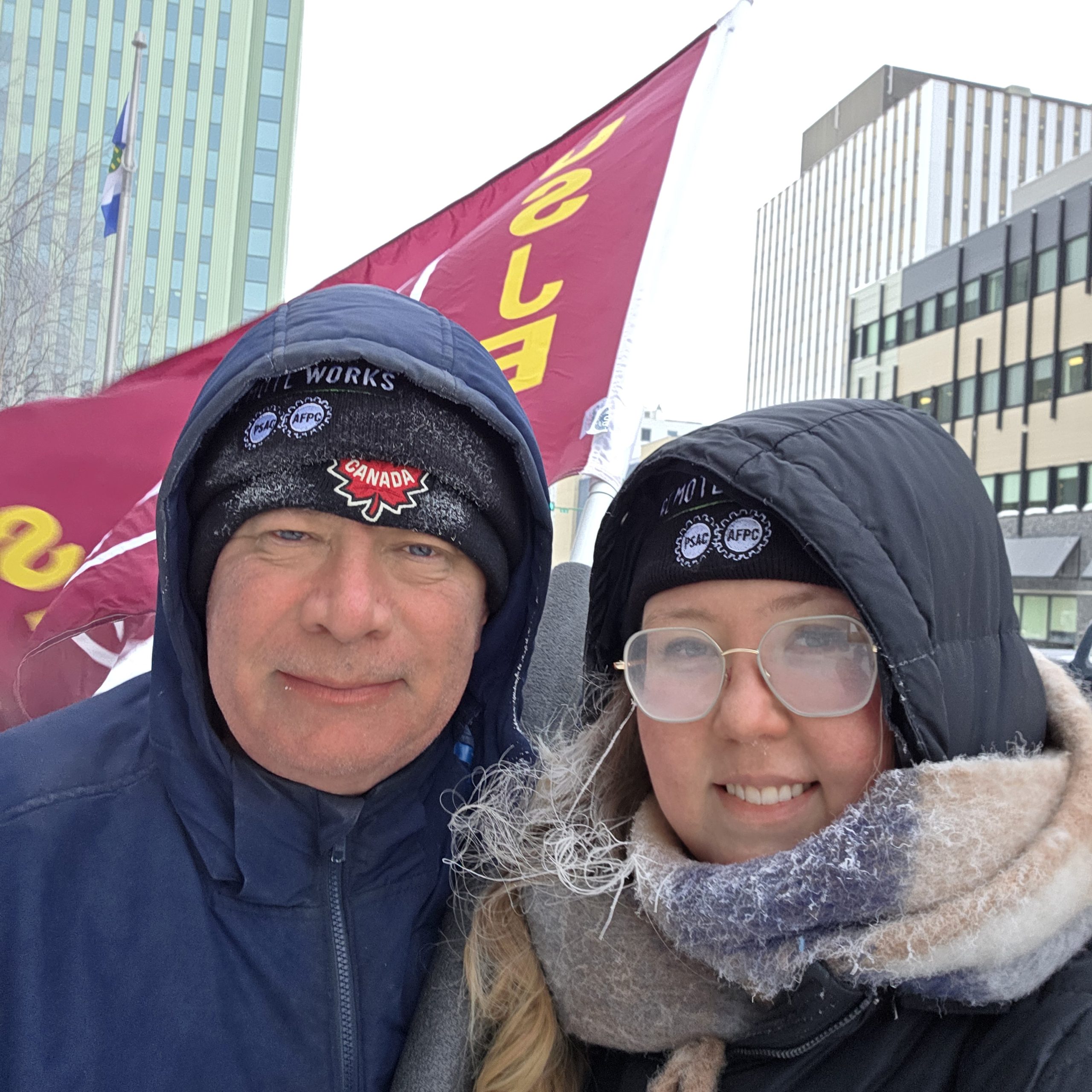 Le froid n’a pas empêché les participantes et participants d’interagir avec les travailleuses et travailleurs qui se rendaient au bureau, soulignant les préoccupations du SESJ concernant les coupes budgétaires du gouvernement fédéral à chaque personne qui passait par les portes. Plusieurs autres membres de l’AFPC ont mentionné avoir entendu parler d’avis de réaménagement des effectifs au sein de leur ministère, un phénomène qui sème l’incertitude au sein de la population de travailleuses et de travailleurs du Nord.